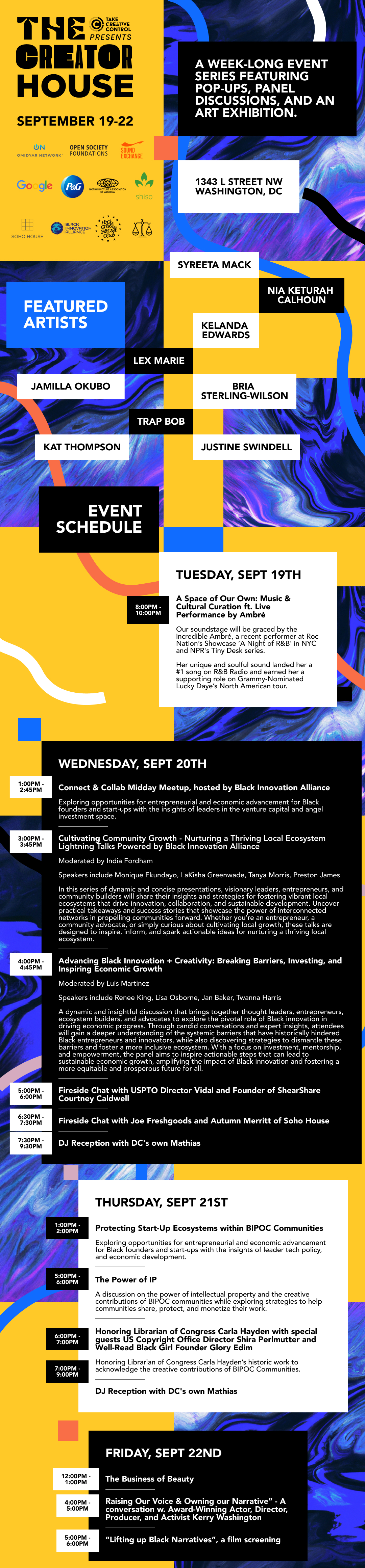 The Creator House is a week-long event series featuring pop-ups, panel discussions, and an art exhibition, celebrating creativity and entrepreneurship.