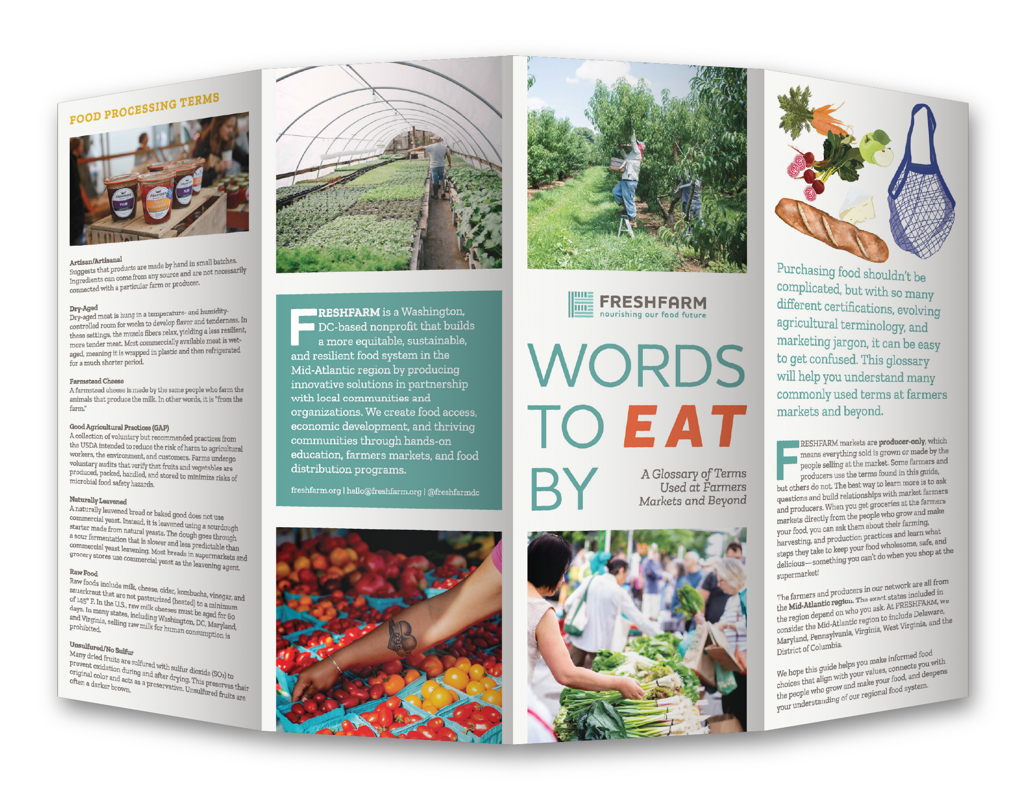 Se pusieron en contacto con DesignChef un poco después de ver nuestro trabajo para Common Grain Alliance para diseñar "Words To Eat By", un folleto que explica una serie de términos utilizados para describir varios tipos de productos alimenticios que se encuentran en los mercados de agricultores. Diseñamos un folleto de 4 paneles que se ajustaba perfectamente a las directrices de su marca, utilizando ilustraciones de estilo pictórico proporcionadas por el cliente.